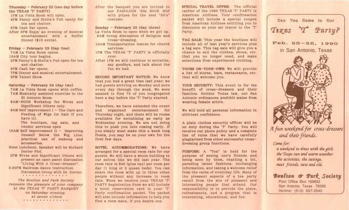 I truly looked forward to the Texas “T” party every year because it was such a fun event and you met so many other people like yourself. The Event was moved from the 7 Oaks motel to the Holiday Inn my second year attending. It was on the River Walk in San Antonio where there was…