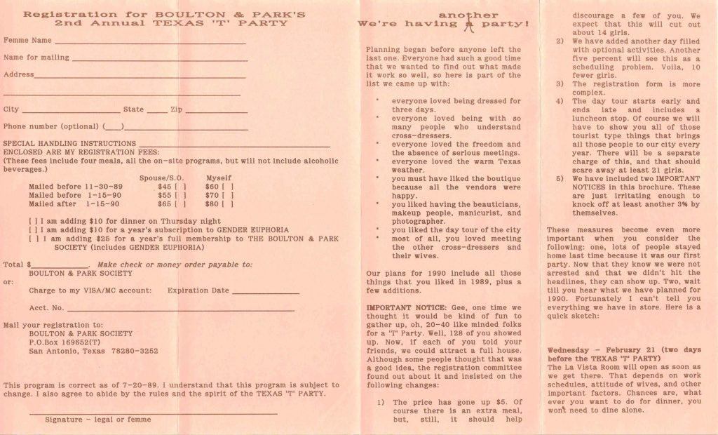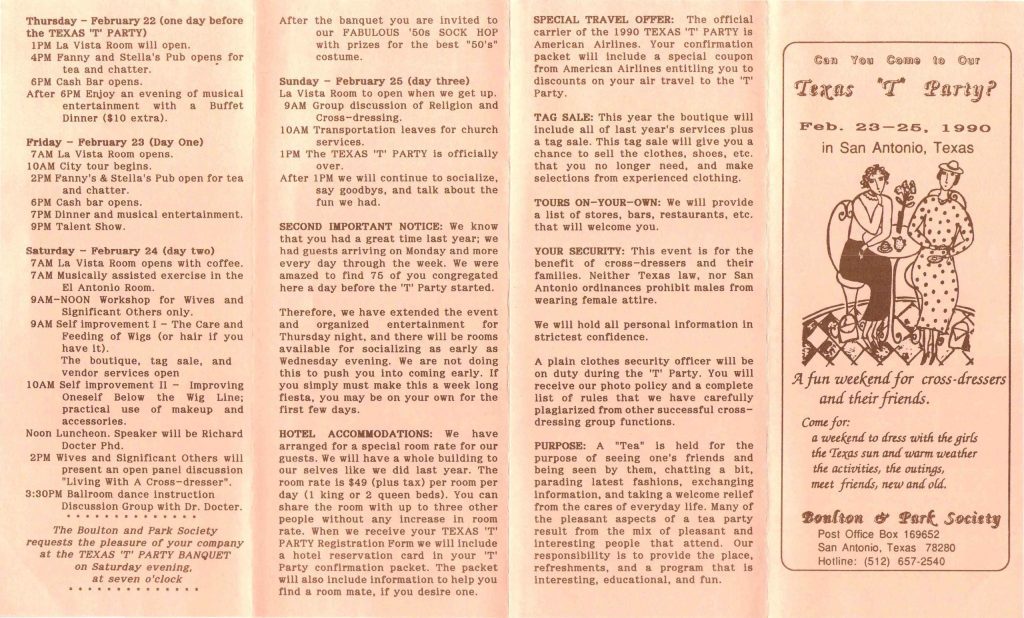 Armed with all the information on the event I pitched it to my wife I invited her to go with me. To my surprise she said sure we don’t know anybody in Texas so I will be comfortable. It was called the Texas “T” Party and it was in San Antonio Texas and started out originally as a home BBQ for members of the local club. So many people showed up they had to move it to a hotel in San Antonio for the next year. I made the arrangements and we went to our first crossdresser convention that February.