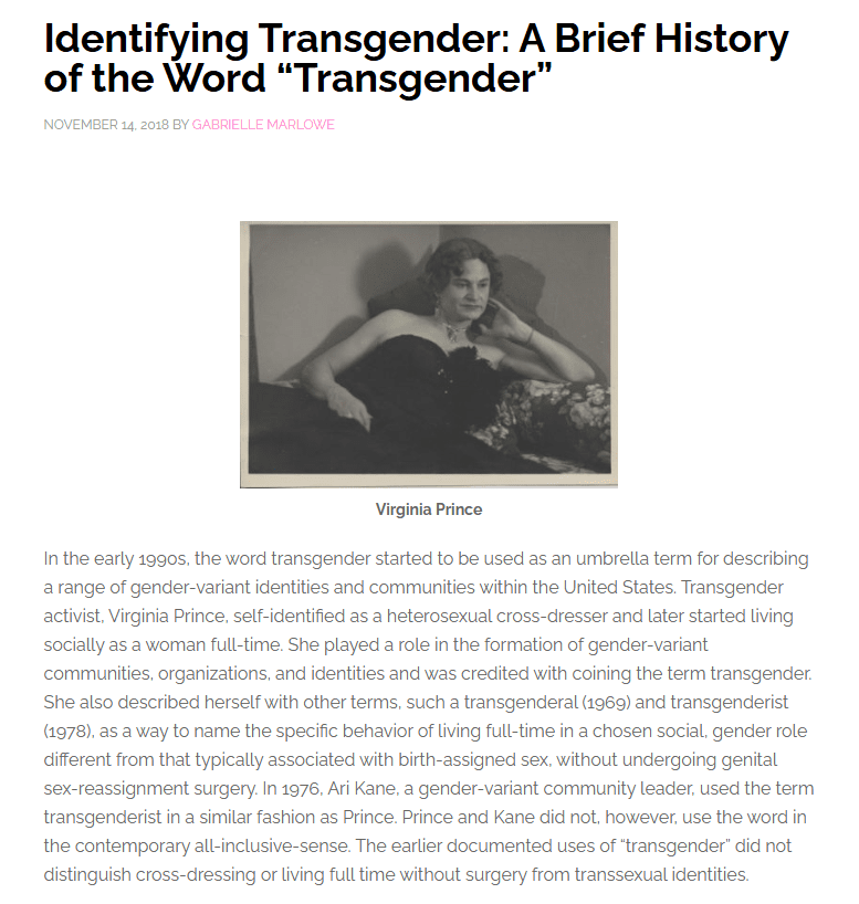 Those just venturing out can make up their own mind what label they prefer and I encourage them to do some research. I urge caution though in doing so because of everyone getting shoved under the Transgender umbrella so they get credit for things accomplished by others. The internet today is full of lazy reporting and outright stupid mistakes by younger writers. I have seen pictures of Air Force officers described as Marines and photos of propeller airplanes in 747 jet articles. The title of article below starts off with Transgender history then references Virginia Prince who identified as a cross dresser but mentioned the terms transgenderal and transgenderist.