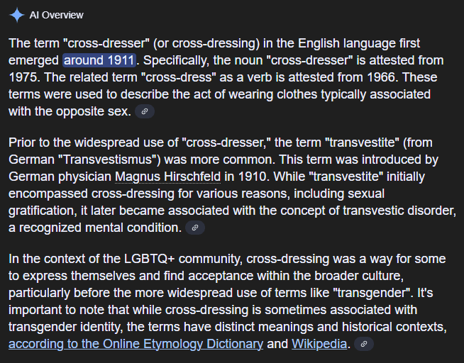 I pasted in the AI search I did on Google below for context for my choice of labels. The last paragraph defines the problem that crossdressers have with the Transvestite label. First of all most 8 year olds don’t have a sex drive and don’t figure out how to play with that thing for another 5 years or so. Also there are many older crossdressers that have lost the function of their Willy and continue to crossdress. I am willing to bet none of the people who came up with the term Transvestic Disorder were crossdressers.