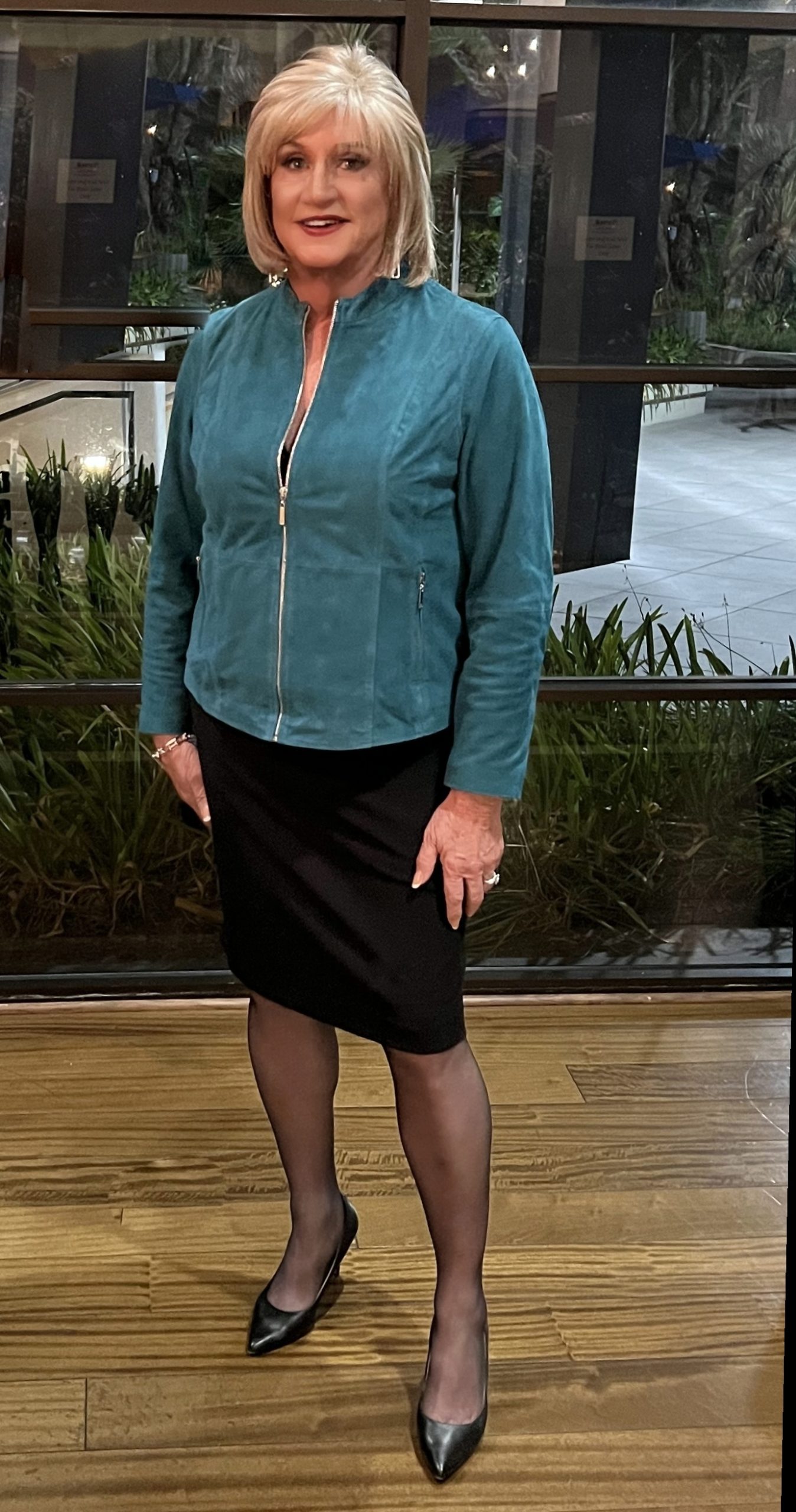 The picture does not really do the jacket justice because it is covered in sequins which are hard to see possibly a filter on the camera or something. I love the jacket but it is not conservative so I will only wear it to certain places where I feel comfortable. I had no reservations about wearing it at TG Rocktober because I know the Tuscany Suites Hotel where they had the event. I have stayed there many times by myself and know some of the staff there so I feel welcome. There were also about 150 TG oriented people all over the place and my ensemble was tame by comparison to some I saw. Wardrobe choices get pretty crazy at some TG events so mine are more like wall paper in the hall.